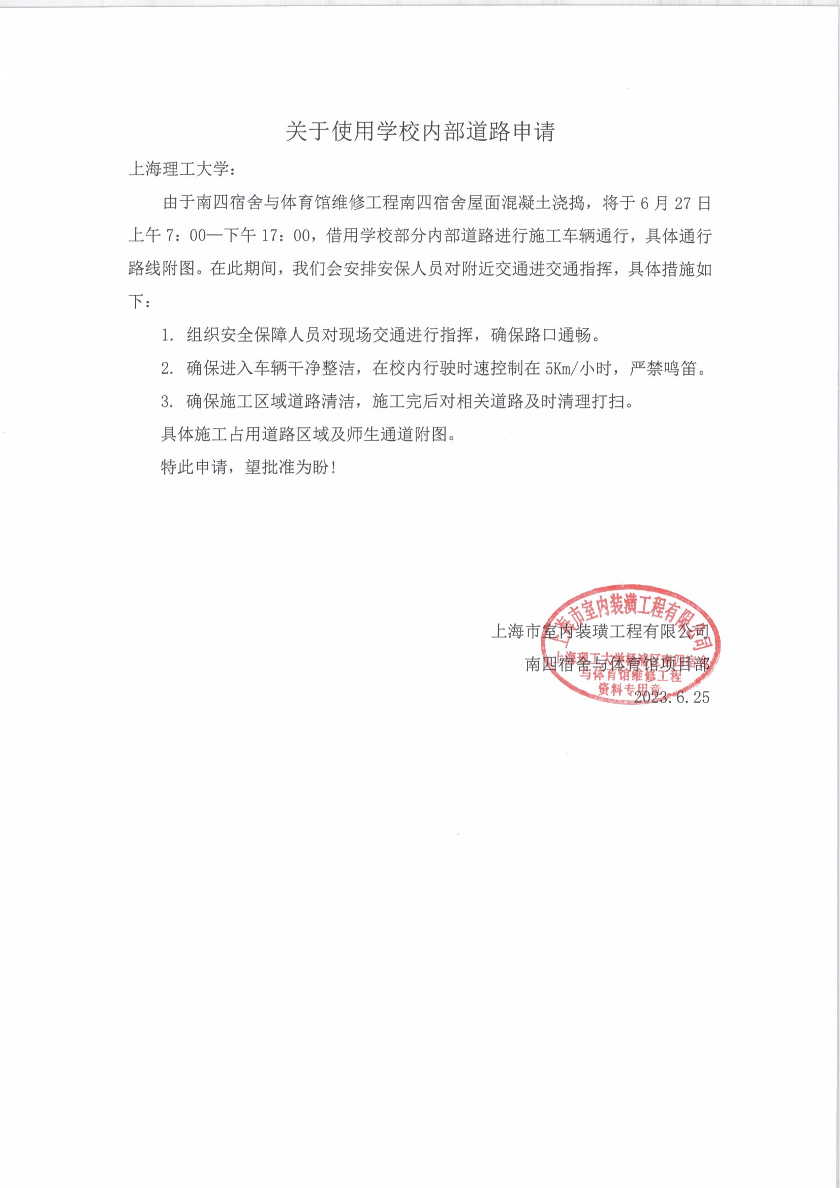 由于南四宿舍与体育馆维修工程体育馆屋面混凝土浇捣,将于6月27日上午7:00—下午17:00,借用学校部分内部道路进行施工车辆通行,具体通行路线附图。在此期间,大型工程车辆进出会对大家的生活和出行带来不便,在此,我们表示歉意。