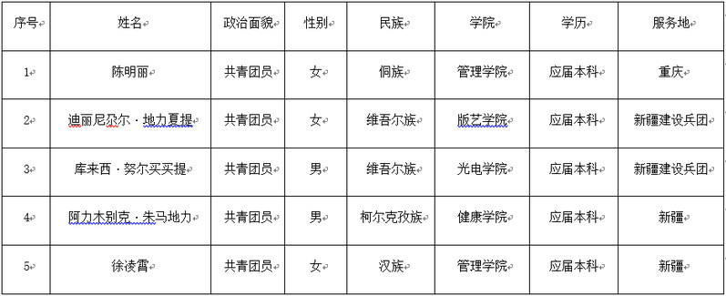 经上海市西部计划项目办复试选拔综合评定及健康检查,今年我校共有5名同学通过复试及体检审核成为本年度上海市大学生志愿服务西部计划预选派志愿者。现将结果予以公示