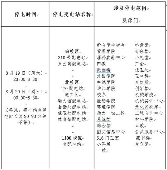 校内部分配电站需检测维护保养,期间会临时停电,请相关学院、部门做好停电准备,由此带来不便,敬请谅解。具体影响范围如下表: