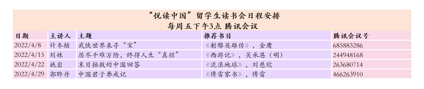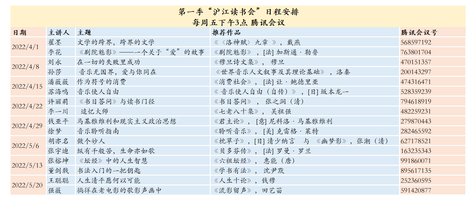 由沪江学院发起的“沪江读书会”第一季将于4月1日正式拉开帷幕,每周五下午3点,在腾讯会议平台,由2位老师为大家推荐一本好书和音乐,带领大家一起阅读欣赏。同时,在留学生中推出“悦读中国”系列活动(具体安排见附件)。让我们的心灵在读书中获得自由,期盼疫情早日散去,那时,我们再一起相约,走出校园,看山中的花树,听水边的鸟鸣!